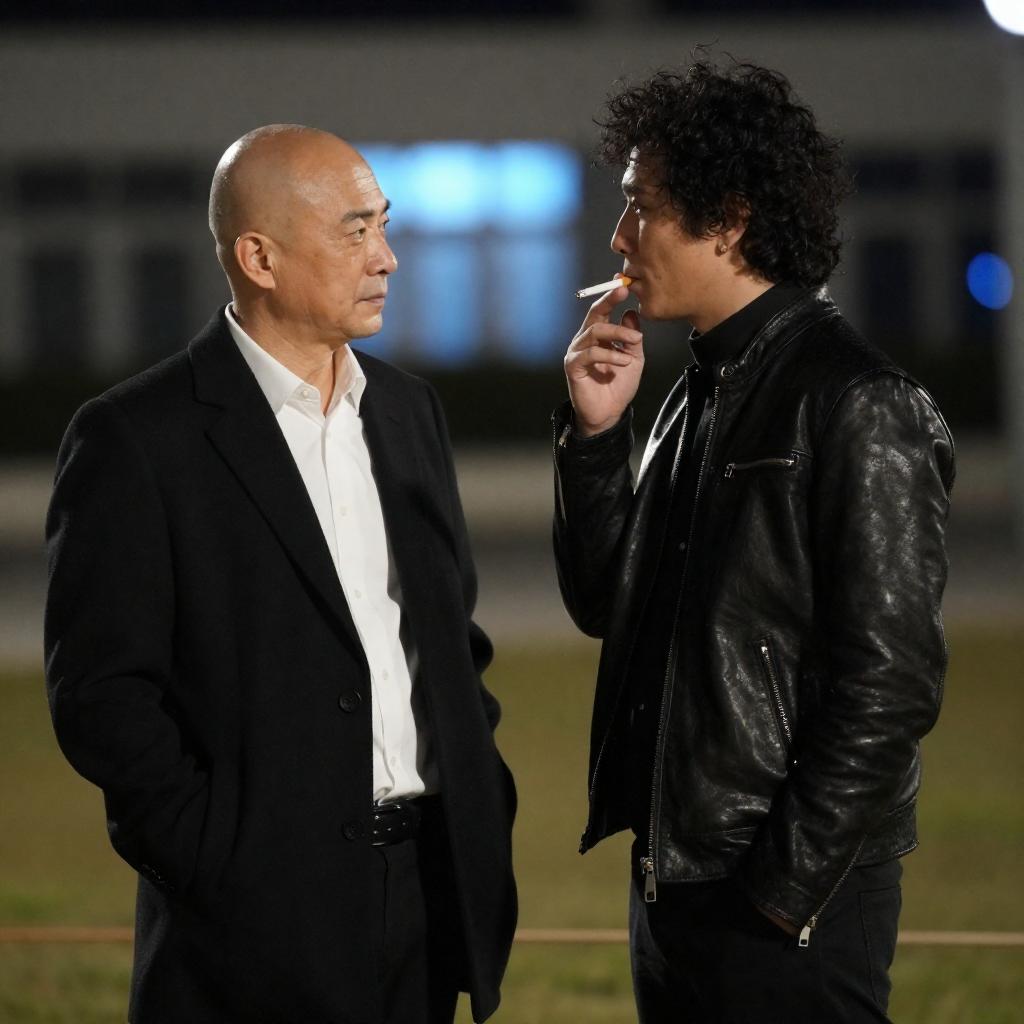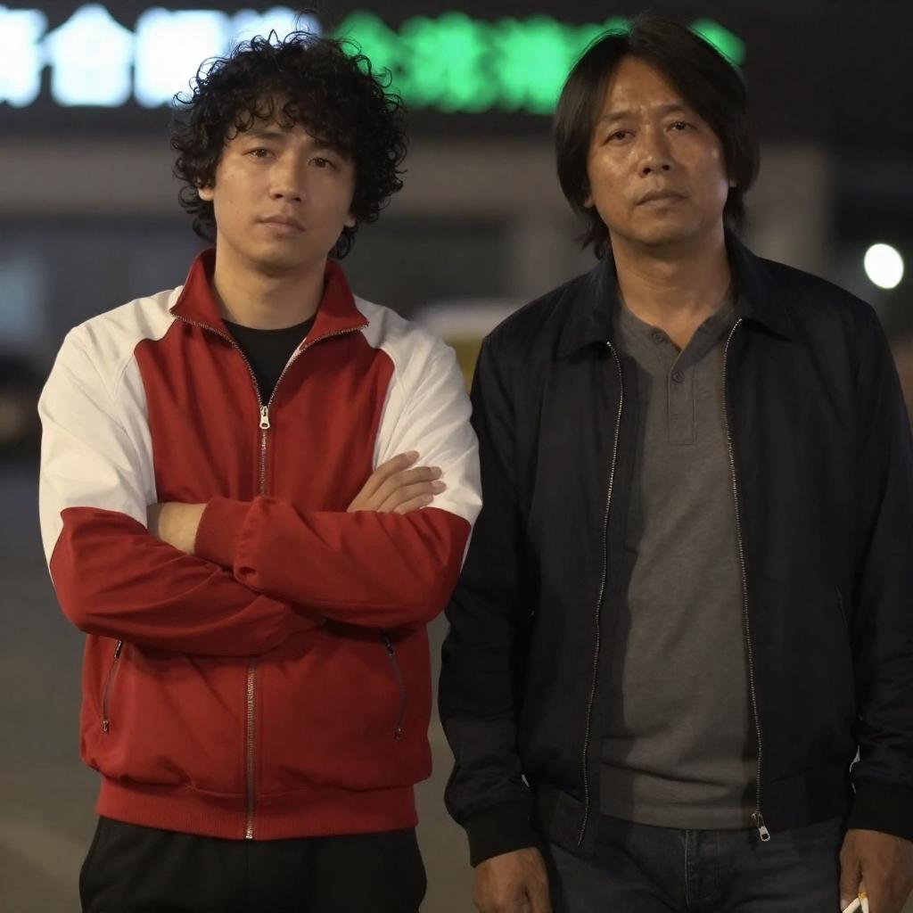 Photograph of three men standing beside a light blue vintage car in a grassy field. Two men in black suits and ties, one with dark hair and sunglasses, the other bald, lean against the car. The third man, with dark hair and a white and blue striped shirt, stands to the left. A blue sign with white is in the background.