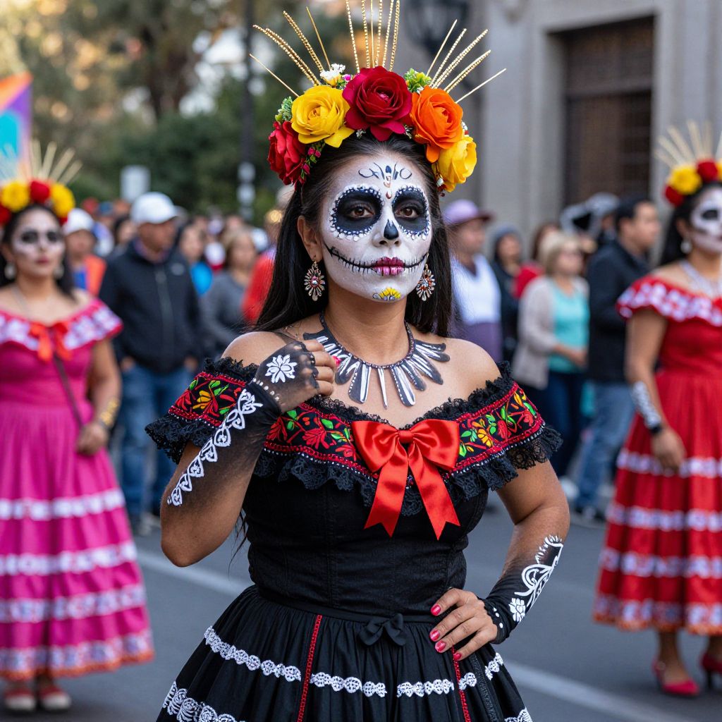 Photograph of a Day of the Dead celebration. A woman in the foreground wears a black lace dress with red and white floral accents, a red bow, and a flower crown. Her face is painted white with black accents, red lips, and a yellow dot on her nose. She has long black hair, hoop earrings, and a necklace with white beads. Background shows blurred people in traditional Mexican dresses and hats, some with similar face paint. The scene is set on a street with trees and buildings in the background. The colors are vibrant, and the overall mood is festive and cultural.
