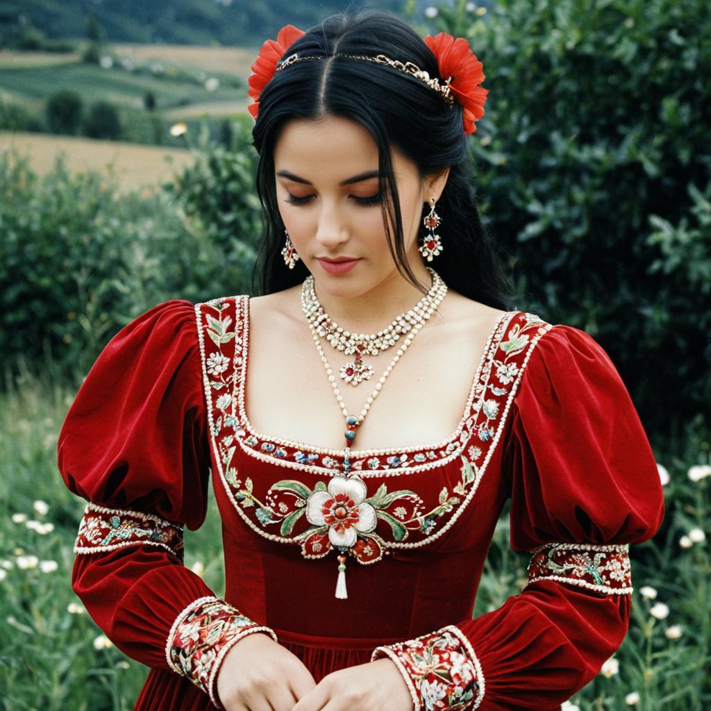 Portrait of a young woman wearing a traditional European national costume featuring a brown dress with floral embroidery and lace details on the sleeves and neckline. She has long black hair adorned with a red and white flower crown. She is accessorized with ornate gold earrings and layered necklaces with red and green gemstones and pearls. The background is an outdoor green space with blurred trees.