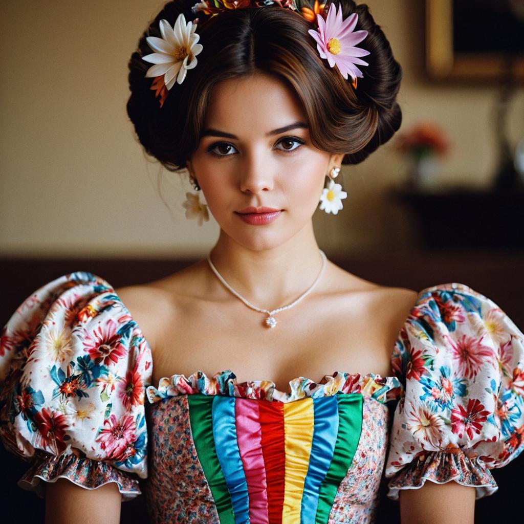 National costume european,1girl, solo, jewelry, necklace, long hair, flower, dress, earrings, realistic, blurry background, outdoors, tree, blurry, hair ornament, hair flower, looking at viewer, black hair, head wreath, short sleeves, brown eyes, brown hair