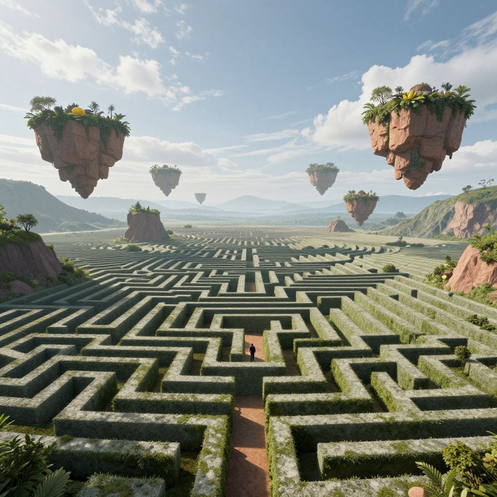 A surreal landscape emerges from an unconventional perspective, blending whimsical intricacies with dreamlike qualities. A vast maze sprawls beneath an undulating sky, filled with floating islands each adorned with smaller versions of the labyrinth below. As one delves deeper into this recursive world, a sense of wonder and trepidation grows, mirroring the emotional journey of introspection and disorientation inherent in human exploration.