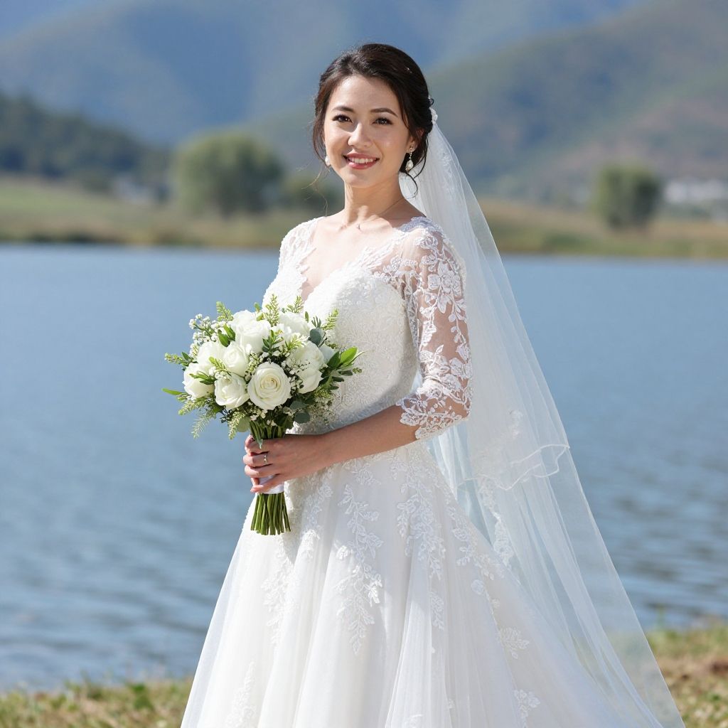 Photograph of a smiling Asian bride with fair skin and dark hair, styled in an updo with a delicate silver tiara. She wears a white lace long-sleeve wedding dress with a deep V-neck, and a white veil drapes over her shoulders. She holds a bouquet of cream-colored roses with green foliage. Her makeup is natural, with pink lipstick. The background is blurred, featuring green foliage and brown soil, suggesting an outdoor setting. The image focuses on the bride's upper body, capturing her elegant and joyful expression.