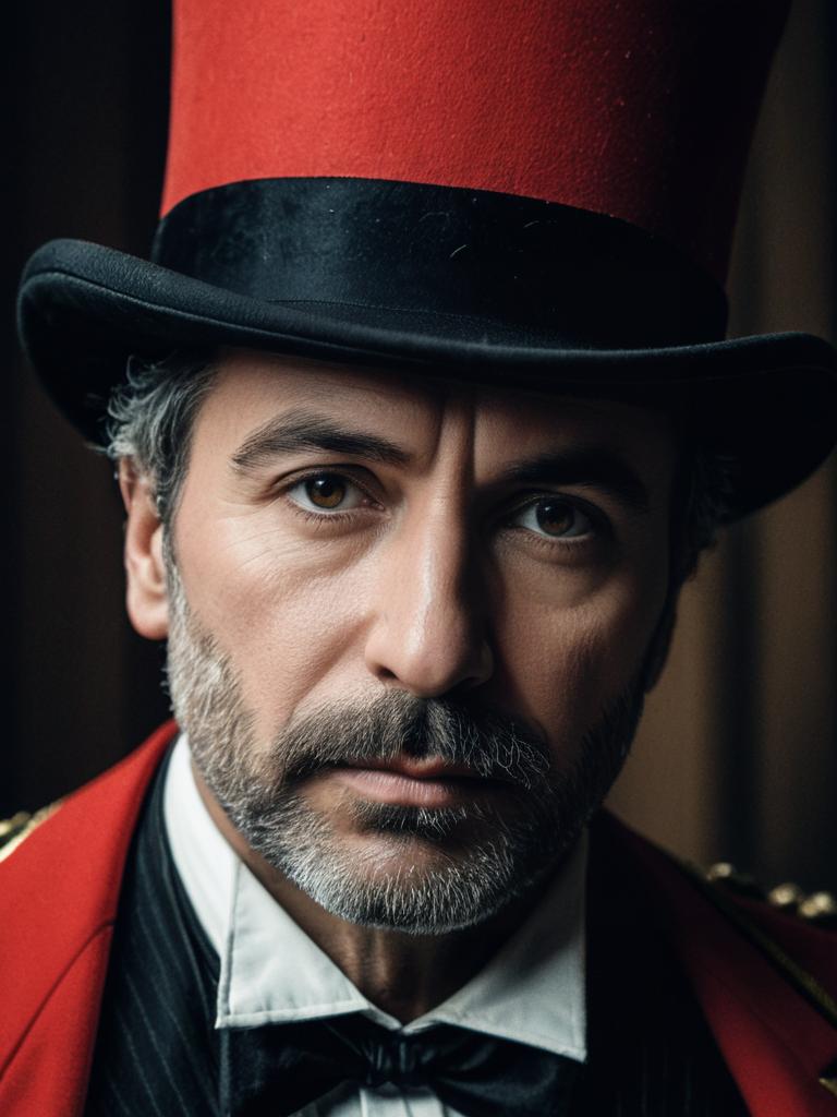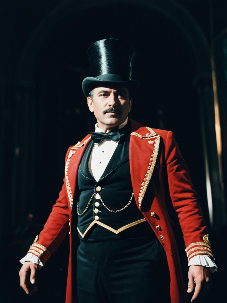 Man in Ringmaster Costume, cinematic realism, dramatic editorial portrait