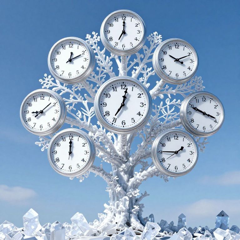 A clock tower grows from the ground like a crystalline tree, its branches substituting for clock faces showing different, contradictory times.