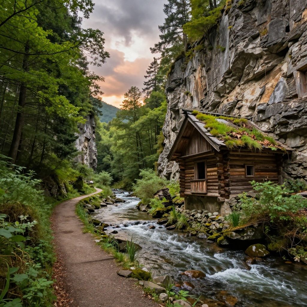 Hyperrealistic art professional photo, scenery, skanzen, river, shrine, narrow forest path, cliffs, ruins, log house, dramatic sky (natural colors, correct white balance, color correction, dehaze, clarity), . Extremely high-resolution details, photographic, realism pushed to extreme, fine texture