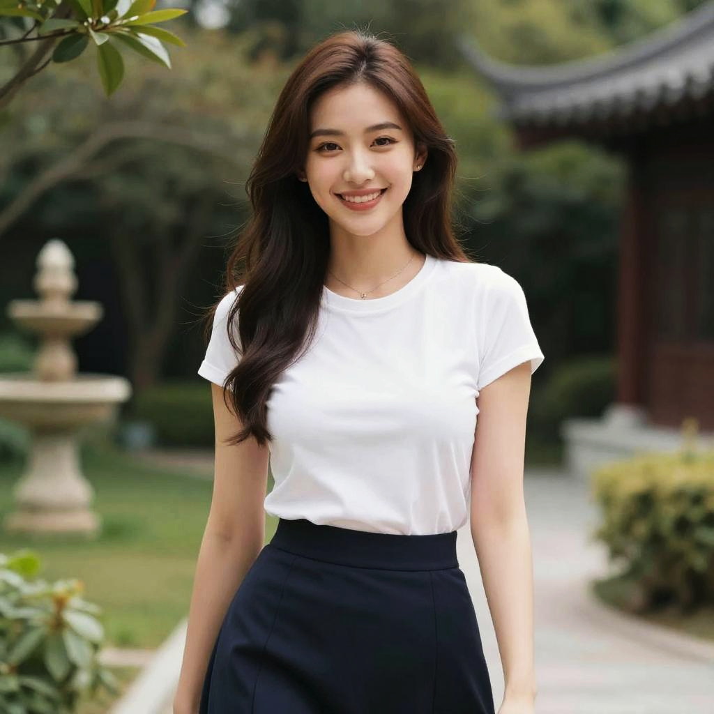 Photograph of an Asian woman with long black hair, smiling, wearing a white off-shoulder top with black ribbon, black high-waisted