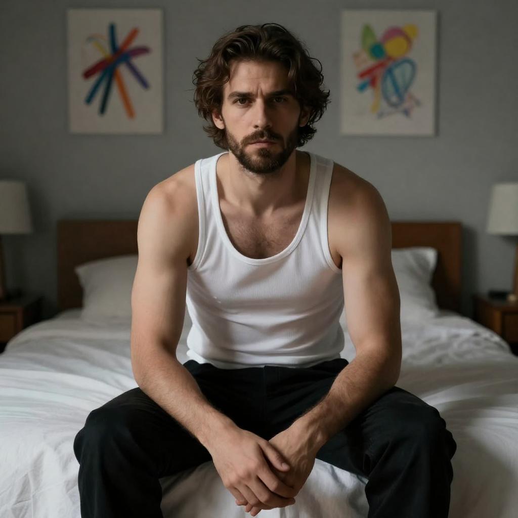 Portrait of a bearded man with shoulder-length brown hair and glasses, wearing a white tank top and black pants, sitting on a disheveled bed with white sheets. The dimly lit room has a rough concrete wall decorated with several abstract drawings, creating a minimalist and modern atmosphere. The man has a calm expression and looks slightly to the side.