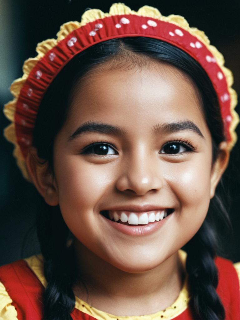 Child in Rosita Costume, close-up cheerful headshot, photorealistic realism
