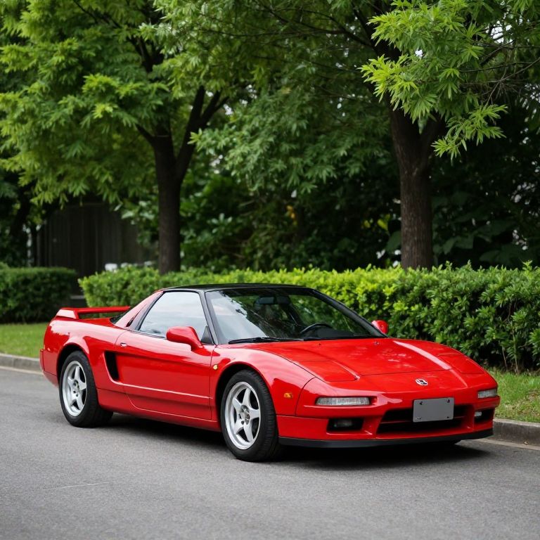 Shiny red 1998 Honda NSX 3.2 6-Speed Manual Targa parked gracefully on a paved road, surrounded by lush green trees and manicured hedges.
