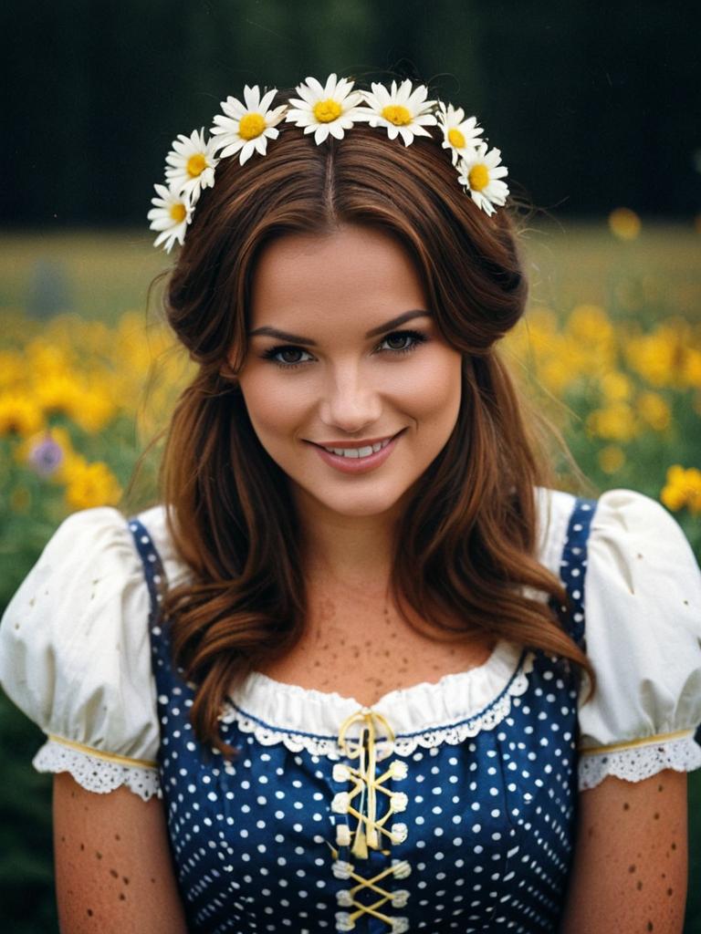 Woman bavarian fancy dress, 1girl, solo, brown hair, long hair, freckles, flower, dress, realistic, drill hair, looking at viewer, smile, blurry, blurry background, brown eyes, short sleeves