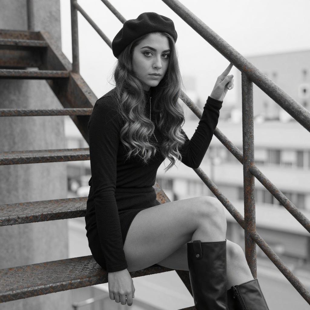 Photograph of a young woman with long, wavy hair, wearing a black long-sleeve top, black mini skirt, black boots, and a black beret. She sits on a rusty, metal staircase with one hand gripping the railing, looking directly at the camera with a serious expression. The background shows a blurred cityscape through the window. The image has a monochromatic blue tint.