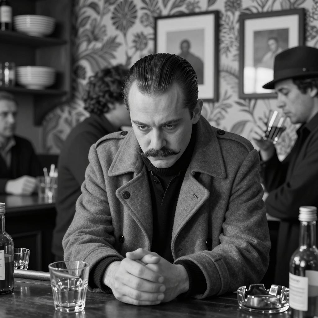 Black and white photograph of a man with dark curly hair and a mustache, sitting tied with rope around his chest and mouth gagged. He wears a double-breasted suit with a tie. Background includes wooden furniture, shelves, and curtains.