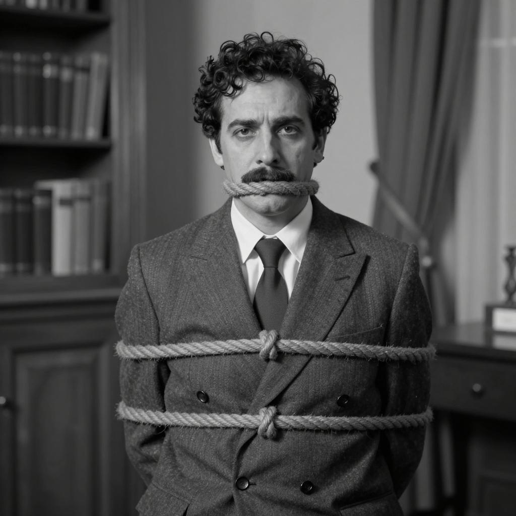 Black and white photograph of a man with dark curly hair and a mustache, tied with rope around his chest and mouth gagged with rope. He wears a double-breasted suit and tie. The background features wooden furniture, bookshelves, and curtains, suggesting a formal or office setting.