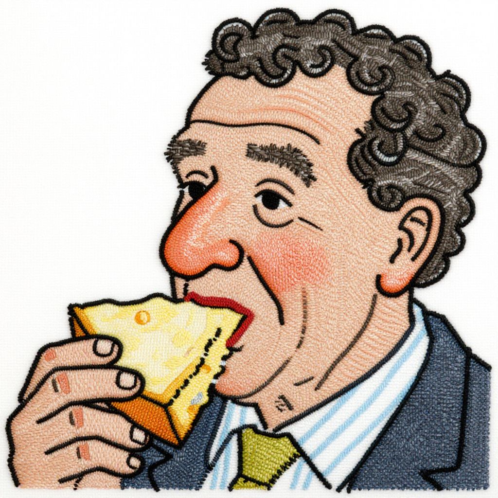 Embroidery Motif a children’s book style illustration, of a older man, with curly dark hair and a large round nose, eating cheese, Quentin Blake,