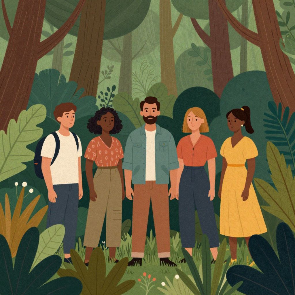 This digital illustration features five diverse individuals standing in a row, flanking a large, dark blue, stone-like statue with aggressive features, including closed eyes and sharp teeth. From left to right: a dark-skinned woman with curly hair, wearing a brown dress; a light-skinned man with short brown hair, wearing a blue t-shirt and dark shorts; the statue with gray speckles; a light-skinned woman with black hair, wearing a beige top and brown shorts; and a dark-skinned man with short brown hair, shirtless, wearing brown shorts. The background is plain white, emphasizing the characters and statue.