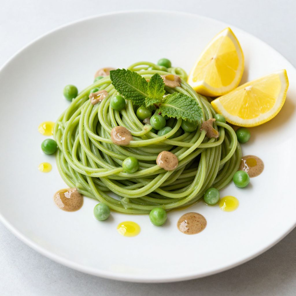 Spring Pea Pasta elegantly presented on a white plate, featuring vibrant green spaghetti intertwined with fresh peas, garnished with seven dollops of truffle oil, a sprig of mint, and two lemon wedges, creating a visually appealing and aromatic dish.