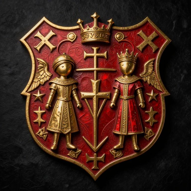 Family crest shapes intricately designed with medieval motifs, heraldic symbols and symmetrical patterns, vibrant gold and deep red colors, detailed textures on metallic surfaces, set against a dark textured background, high resolution, fantasy art style