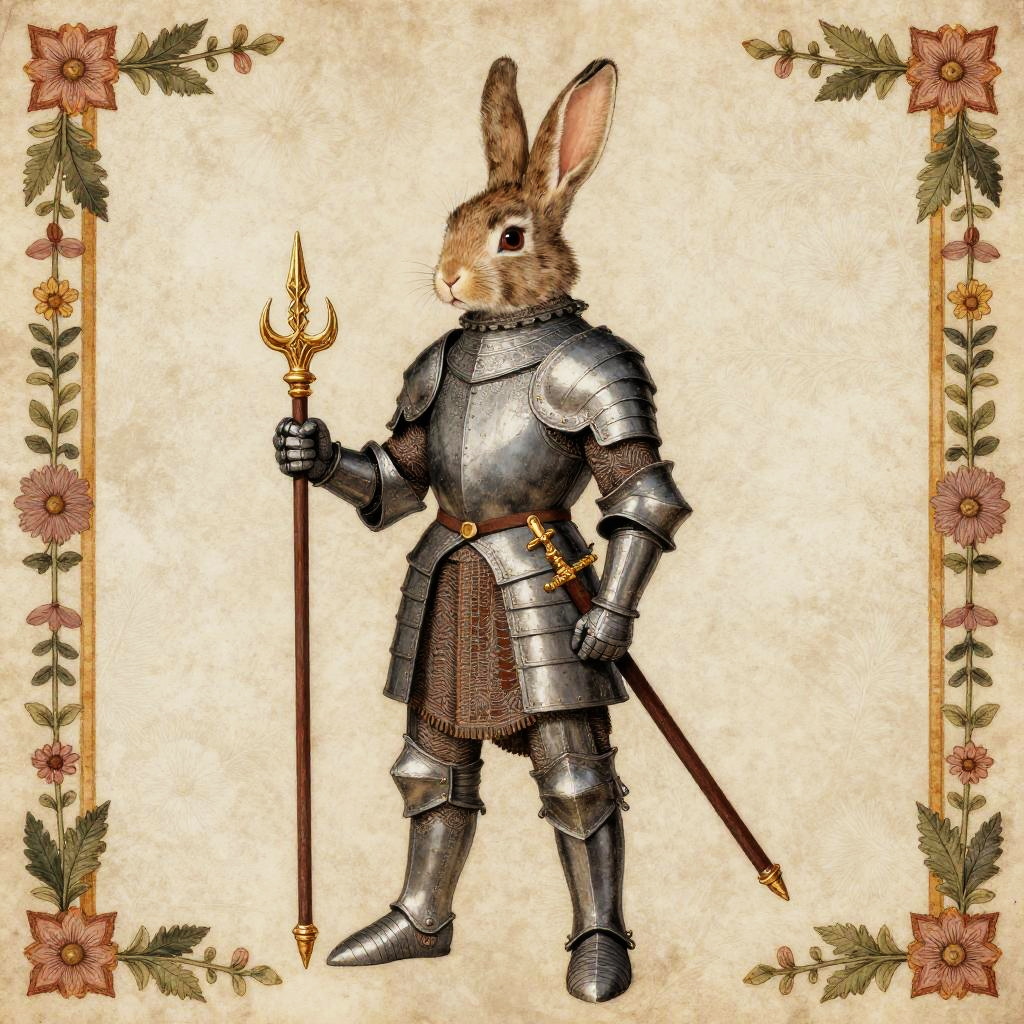 Digital illustration of an armored rabbit holding a trident, standing in a floral-framed medieval background, with a sword at its side.