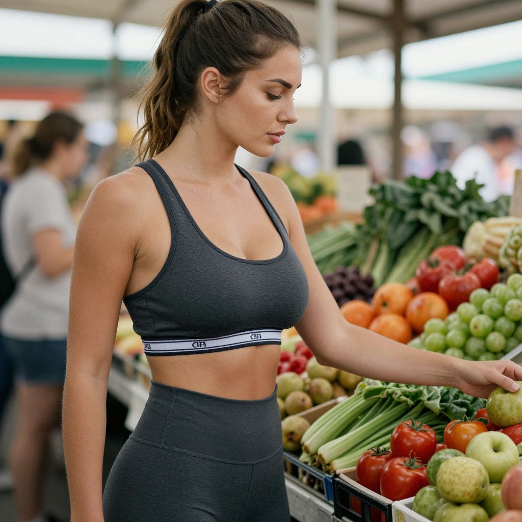A woman, lithographic film style, athletic leisure, charcoal grey scoop neck sports bra with branded elastic band, racerback design, coordinated high-waisted leggings, ponytail hairstyle, at a food market, browsing fresh produce. Sexy. Pretty face and beаutiful eyes. Big breasts