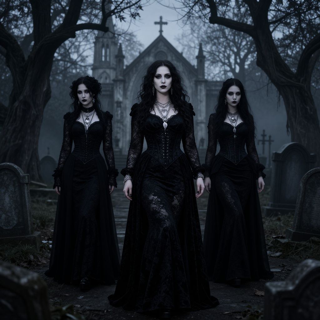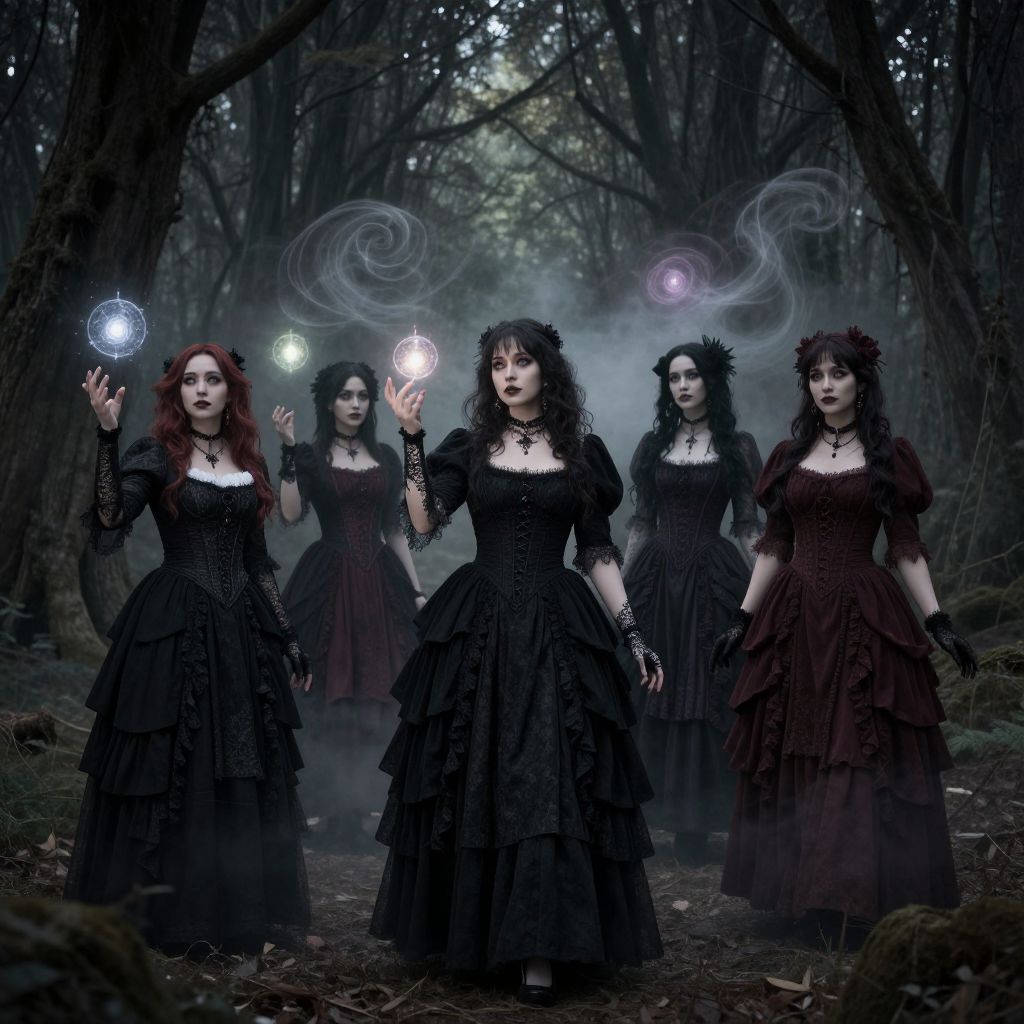 Curvy goth women gathered in a dark enchanted forest, wearing Victorian-inspired gothic attire with layered skirts, lace gloves, and chokers, glowing magical orbs floating around, ethereal mist swirling, hauntingly beautiful and surreal atmosphere with muted colors.
