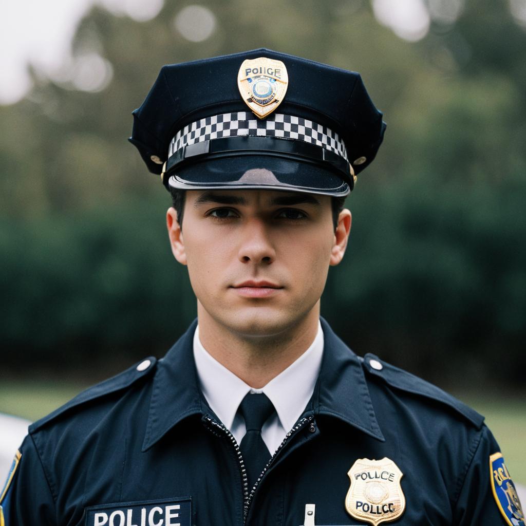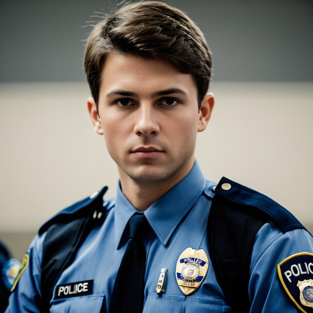Shorts cop costume,1boy, male focus, solo, police, belt, police uniform, black belt, brown hair, jacket, shirt, pants, short hair, closed mouth, long sleeves, policeman, realistic, pocket, uniform, black pants, cowboy shot, police badge, black shirt, looking at viewer, black jacket