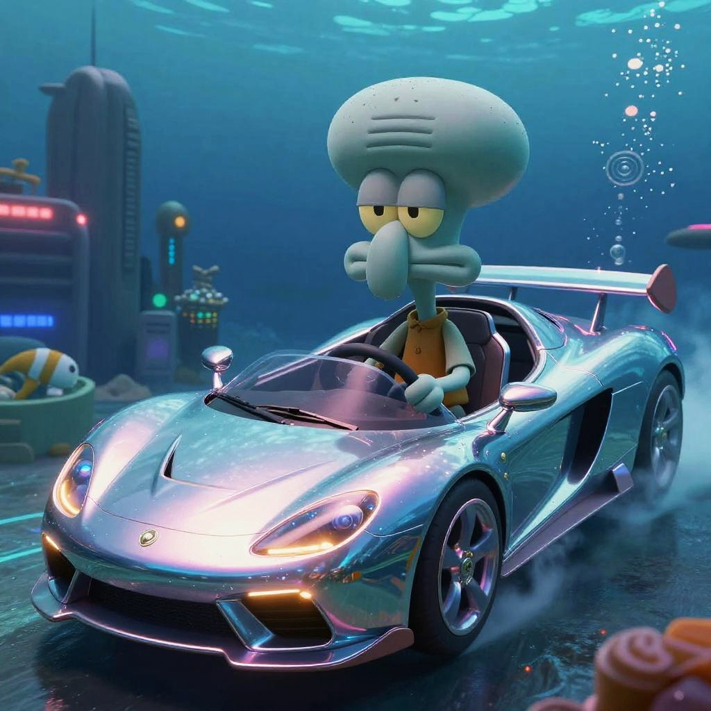 Squidward gangster leaning against a graffiti-covered wall, gold chains around his neck, urban streetwear with a bandana tied around his head, vibrant city night scene with glowing signs, dynamic composition, comic book style.