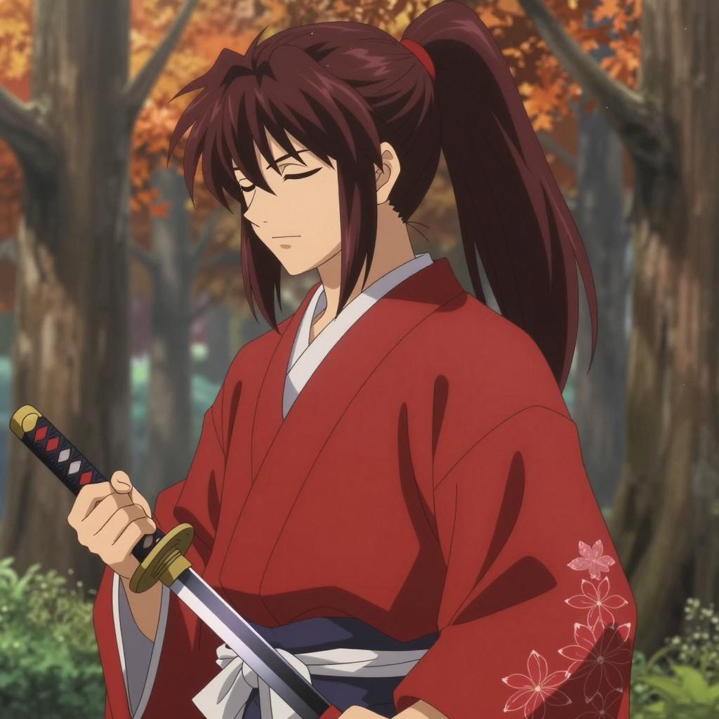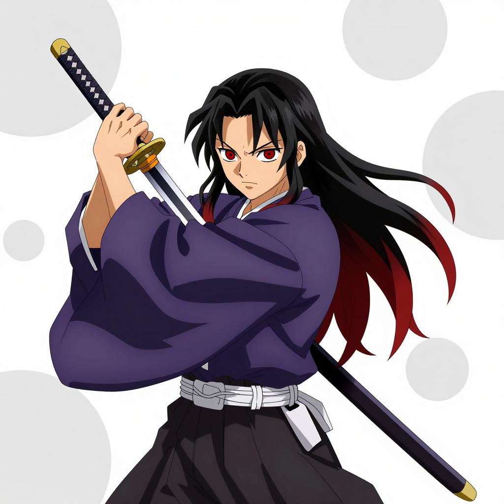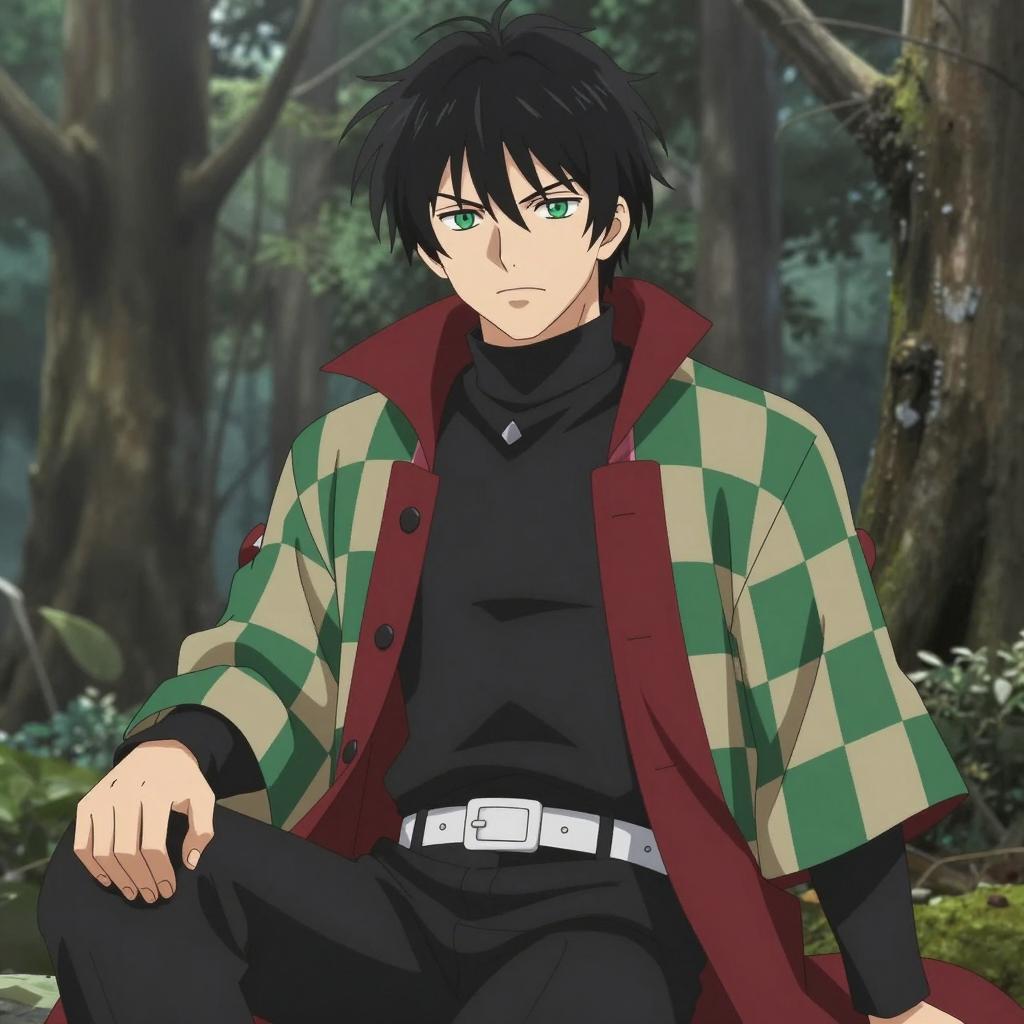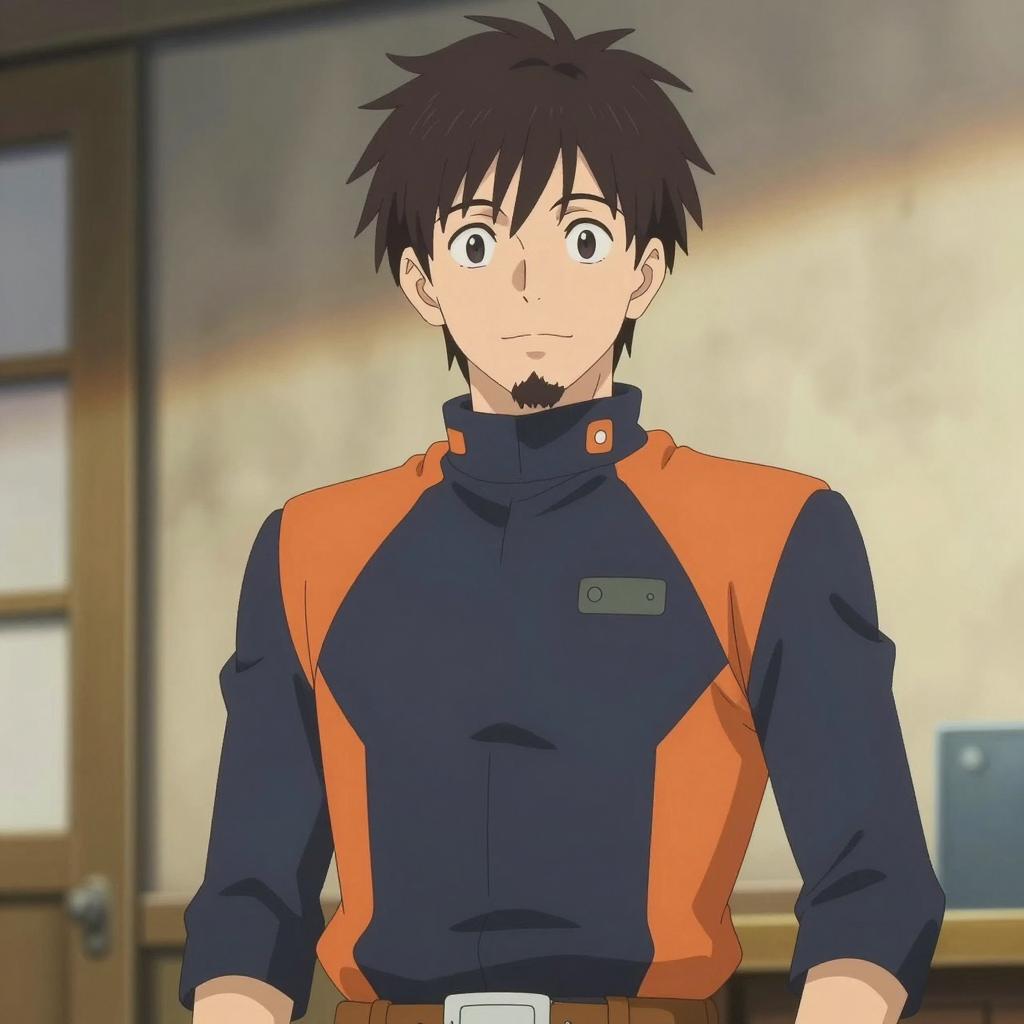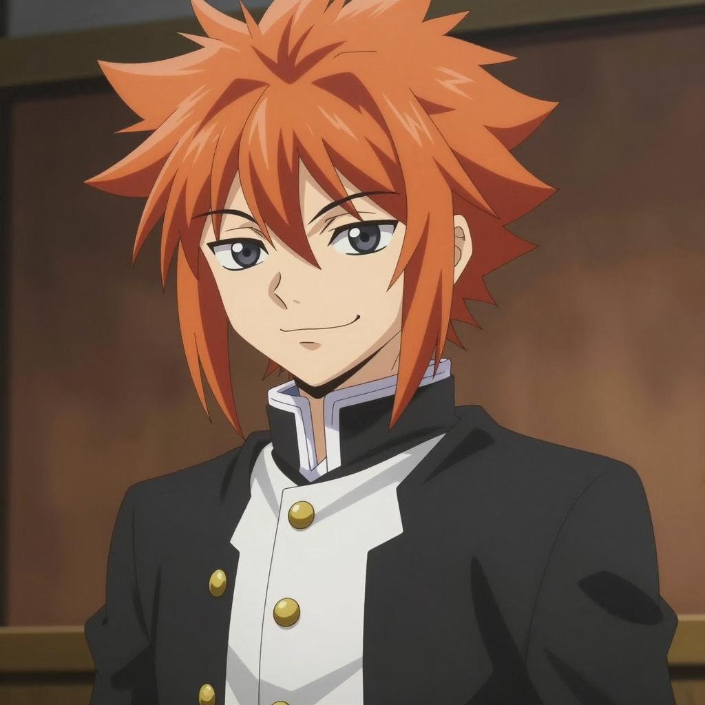 Anime-style photograph of a person with pale skin, orange and red spiky hair, black and white school uniform, gold buttons, white collar, and black facial makeup with thick black eyebrows. Smiling slightly. Warm brown background. Upper body.