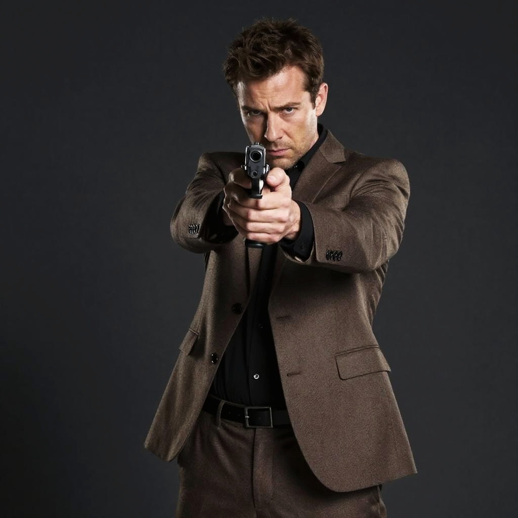 Photograph of a serious-looking man in a dark suit and tie, holding a black handgun with his right hand, pointed forward. He's wearing black sunglasses and has short hair. The background is a dark, gradient gray, creating a dramatic, shadowy effect. The man's expression is focused and intense. The overall mood is intense and mysterious.