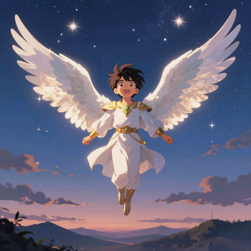 Digital anime-style illustration of a young, blue-eyed, blue-haired angelic boy with large white wings, sitting on a golden cloud. He has fair skin and is dressed in a white, sleeveless cloth. The boy holds a glowing, radiant orb of light in his hands, emitting bright yellow and orange beams that radiate outward. The background is a dark, starry sky with sparkling stars, enhancing the celestial theme. The boy's innocent expression and the luminous light create a sense of wonder and divinity. The overall color palette includes vibrant blues, whites, golds, and oranges.