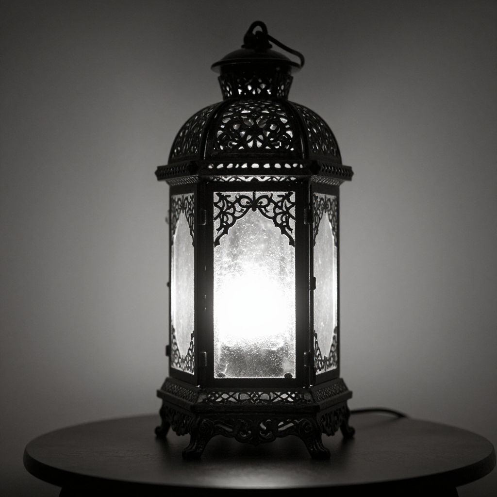 Photograph of a black, intricately designed, ornate lantern with a glowing white light, standing on a round wooden base against a gradient gray background
