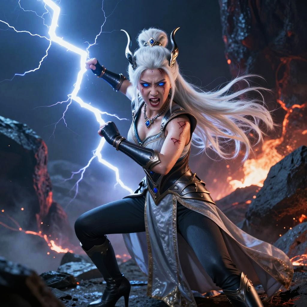 (highres, high quality:1.2), intricate details, cinematic lighting, sharp focus, depth of field, MiaoYing, mature female, solo, fighting stance, casting spell, (lightning:1.1), blue thundercloud, volcanic eruption, epic background, rocks, rage face, open mouth, battle cry, wounded, (sweat:0.7) face, white hair, long hair, high ponytail, lipstick, makeup, detailed hair, detailed face, blue eyes, glowing eyes, bright pupils, necklace, horned headwear, armored dress, breastplate, (single gauntlet:1.2), long dress, high heel boots
