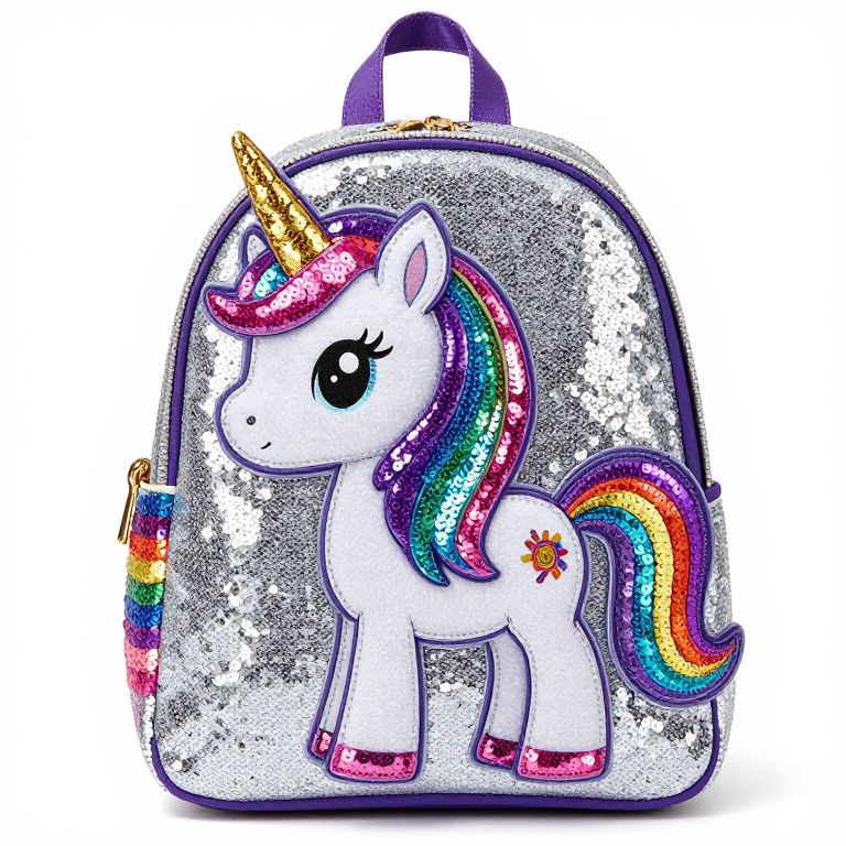 A vibrant Sequin Rainbow Unicorn Backpack features a playful cartoon-style design with a glittery silver base adorned with colorful sequins forming a rainbow mane and tail, complemented by a gold horn and expressive black eyes, all crafted in a high-definition, eye-catching digital art style.
