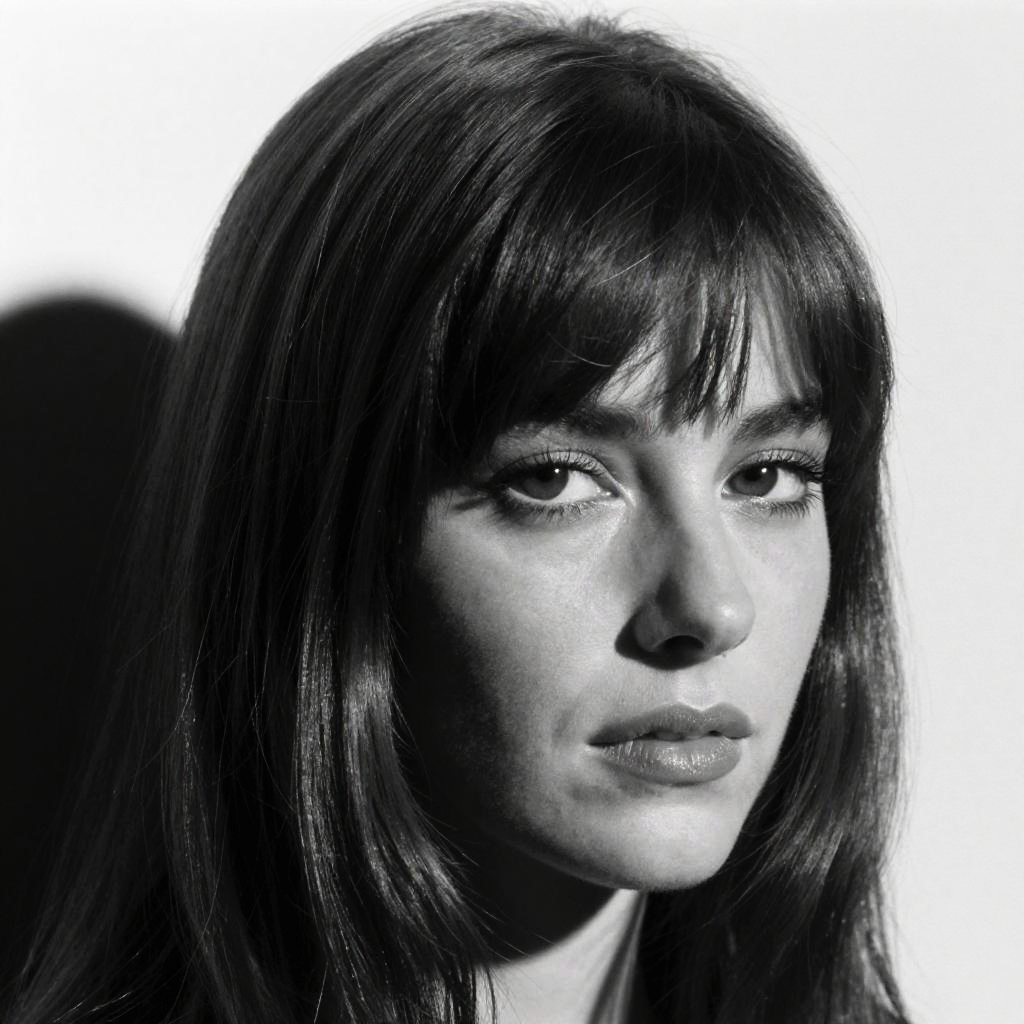 Close-up of Uma Thurman bangs, sleek and stylish cut, dramatic shadows, high contrast black and white photo, classic film star vibe, sharp focus on hair texture