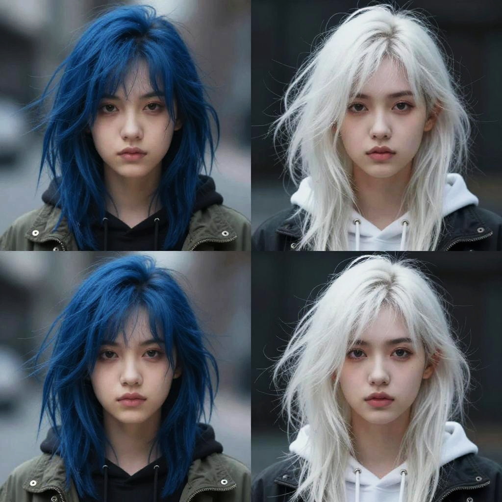 This is a digitally edited photograph featuring a young woman with East Asian features, presented in a four-panel collage. She has two distinct hair colors: deep blue and white. Her blue hair is in the top and bottom left panels, while her white hair is in the top and bottom right panels. She has straight, slightly messy hair with bangs covering her forehead. Her expression is neutral, with slightly parted lips and a direct gaze. She wears a dark green jacket over a black hoodie. The background is blurred, suggesting an urban setting. The image emphasizes her contrasting hair colors and minimalistic style.