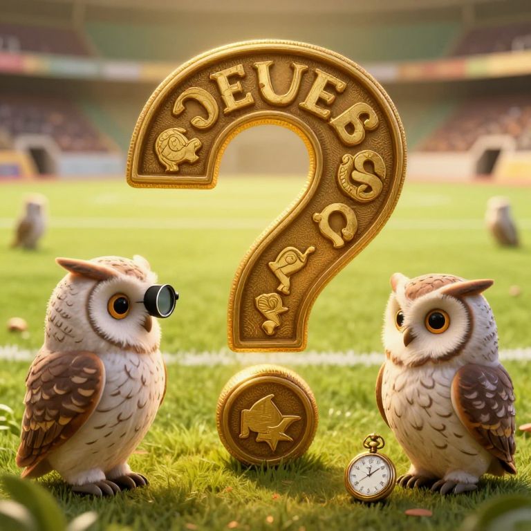 Photorealistic CGI image featuring two adorable, cartoon-style owls on a sunny grassy field. The left owl wears a black magnifying glass on its head, while the right owl stands slightly behind a large, golden, ornate question mark with "JEUX" engraved in uppercase letters. The question mark has symbols like a star and a leaf on it. A small, gold pocket watch lies on the grass in front of the right owl. The background shows a blurred, colorful stadium with seats and a bright, sunlit sky. The overall scene has a playful, whimsical feel.