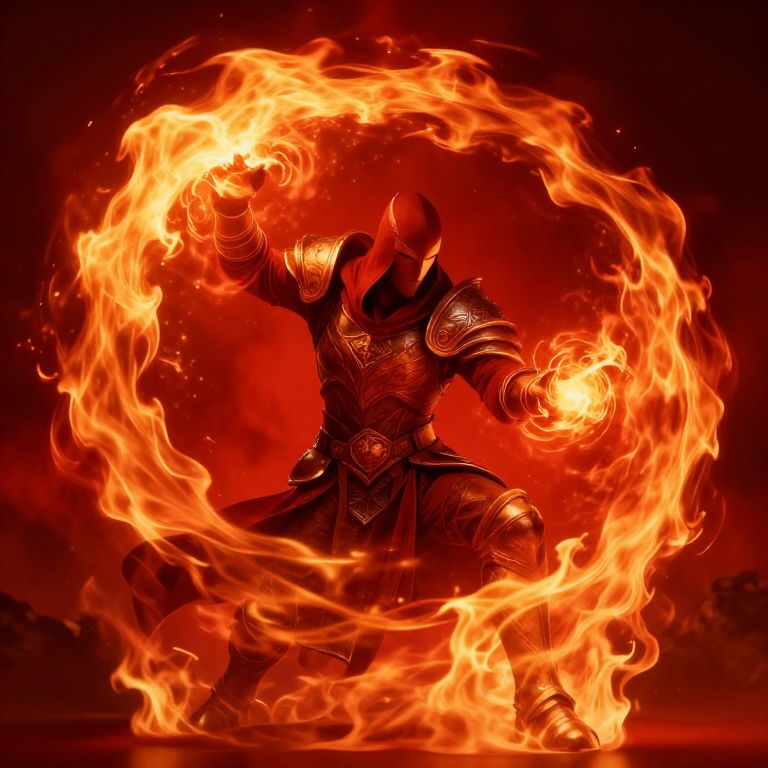 Red background mtg scene featuring a powerful sorcerer casting a fiery spell, intense flames swirling around, dynamic lighting highlighting the figure, intricate fantasy armor, dramatic and mystical atmosphere