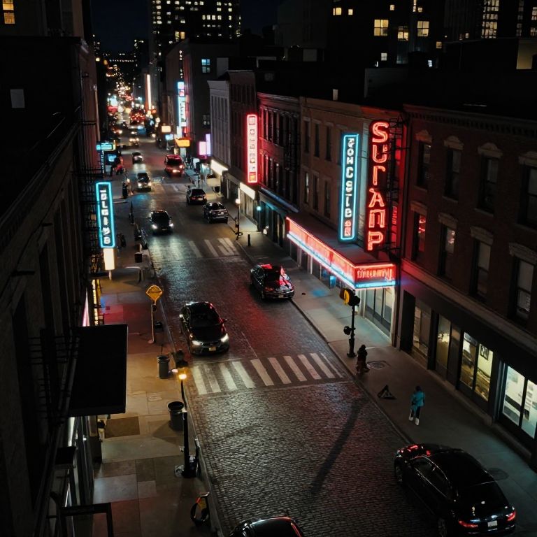Craft an image reminiscent of Edward Hopper's nocturnal masterpieces, depicting a bustling city street from an unconventional aerial perspective. This scene showcases a dense network of glowing neon lights against the backdrop of an active nightlife, casting intricate shadows on the cobblestone path below. The captivating interplay of light and shadow in this urban tableau conveys both allure and solitude, inviting viewers to delve into the emotional nuances hidden within the city's lively activity.