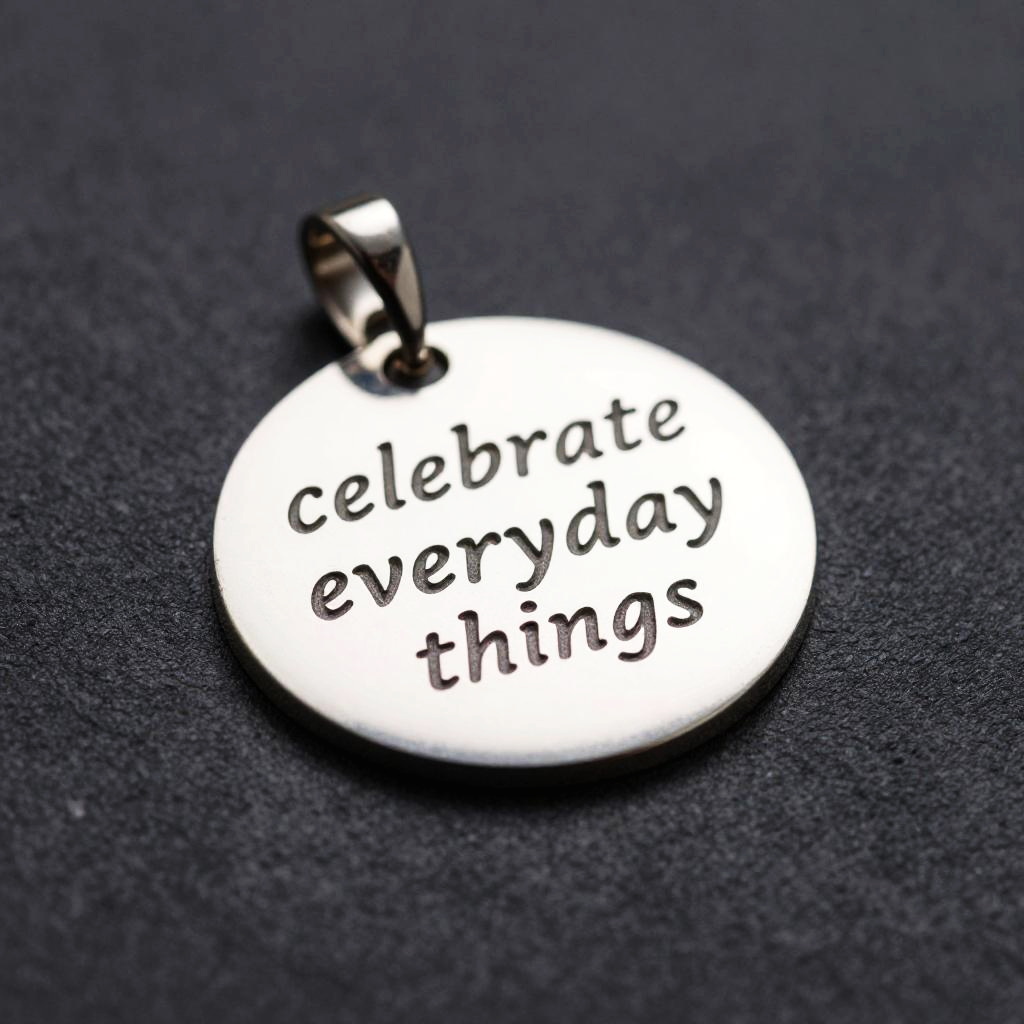 Photograph of a shiny, oval-shaped silver pendant lying on a dark, textured surface. The pendant has white, cursive text that reads "celebrate everyday things." The text reflects light, creating small white highlights on the pendant's surface. The pendant is positioned slightly diagonally, with light and shadows adding depth to its metallic sheen.