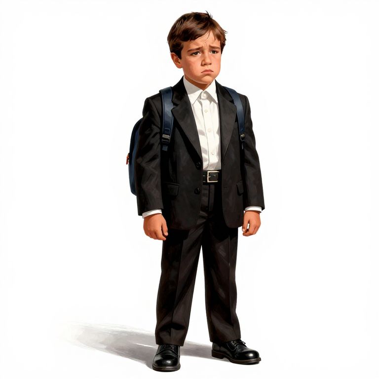 Vito Corleone full body image of little boy looking sad and confused on his first day of school on white background in the style of Sergio Aragones,