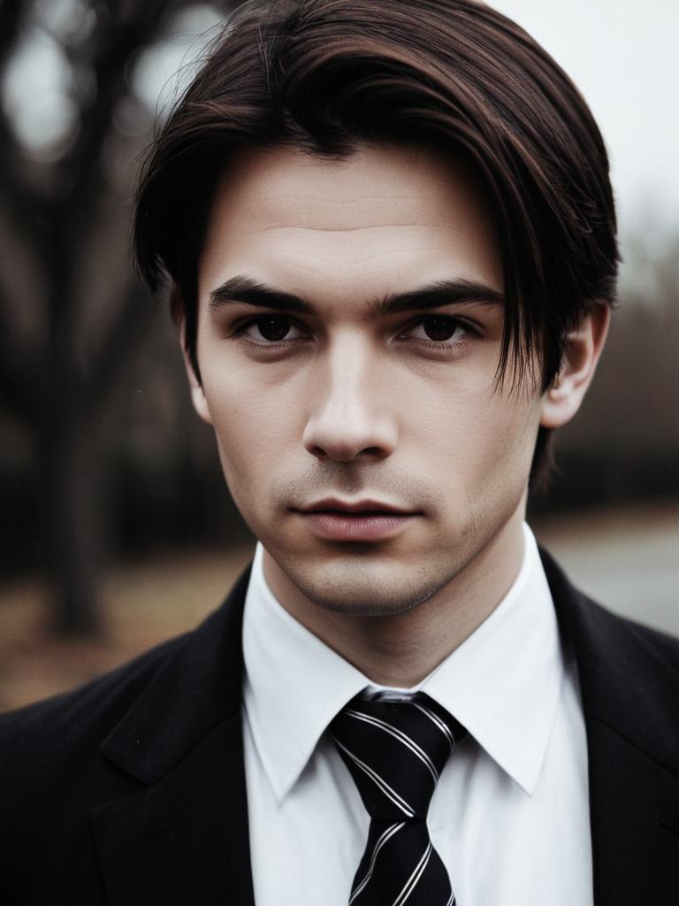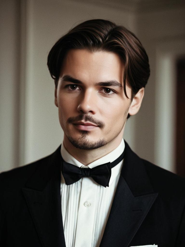 Portrait of a young man wearing a vintage formal black suit with a black bowtie and white pleated collared shirt. The man has medium-length brown hair styled back, light facial hair including a mustache and beard, and is looking directly at the camera with a neutral expression. The background is blurred, emphasizing the upper body and detailed attire, reminiscent of early 20th century fashion.