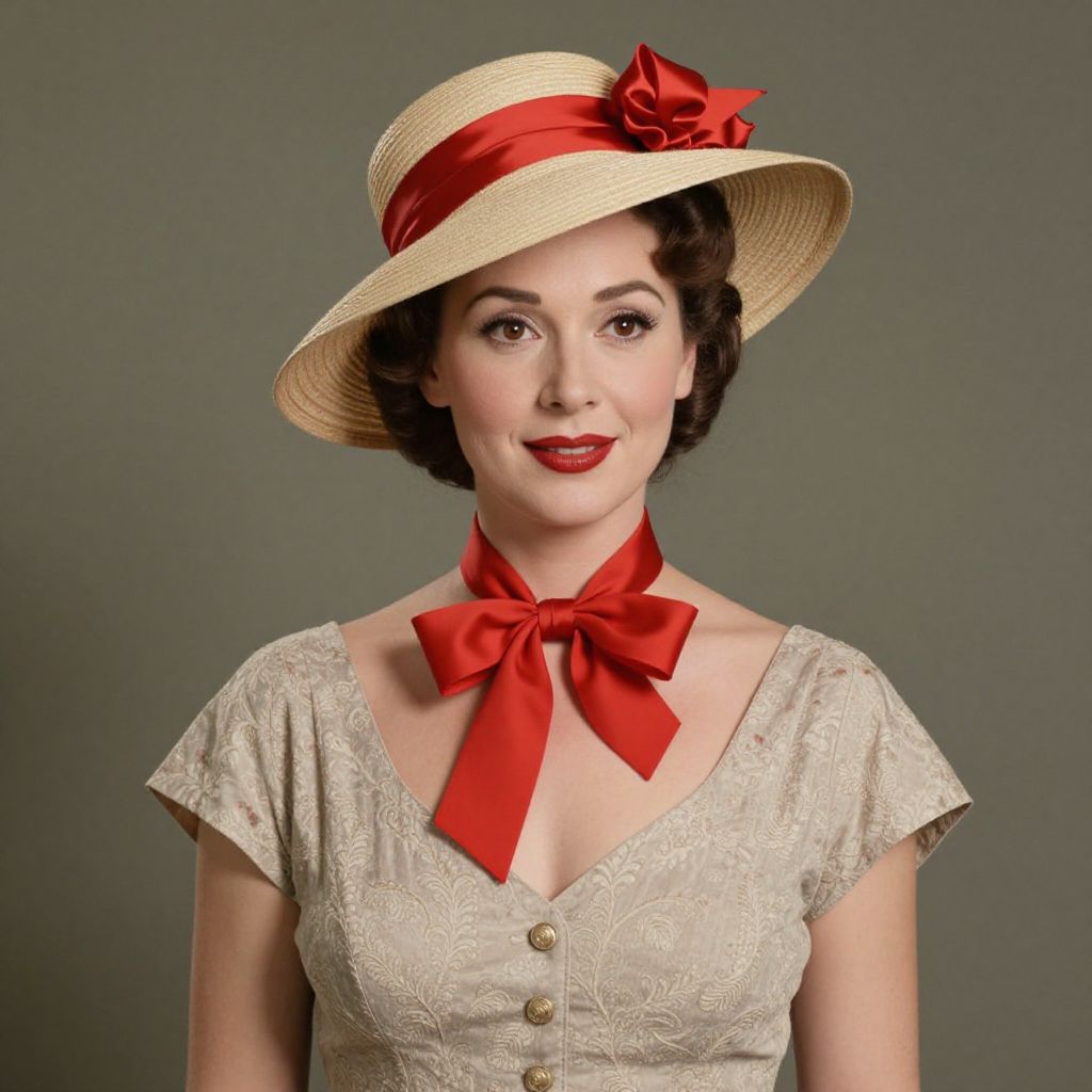 Photograph of a fair-skinned woman with short, wavy brown hair, wearing a cream-colored, short-sleeved, lace dress with a deep V-neck and three gold buttons. She has red lipstick and subtle makeup. She wears a beige straw hat with a wide red satin ribbon tied into a bow, matching the red ribbon tied around her neck in a bow. The background is a plain, muted gray. The woman's expression is gentle and slightly smiling. The lighting is soft, highlighting her features and the textures of her dress and hat.