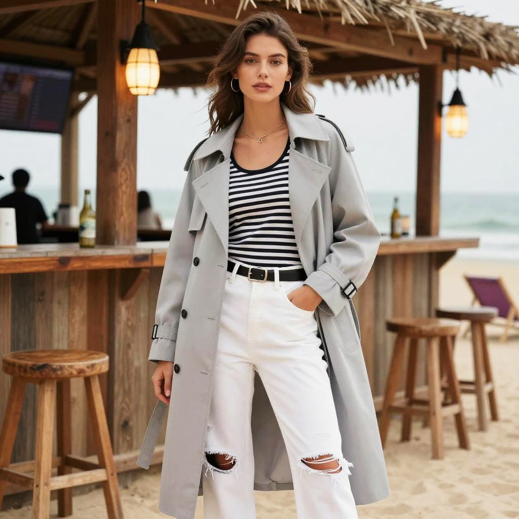 A lean woman in a jc staff visual style, dressed in a black leather biker jacket, grey cotton drawstring shorts, and a black cropped top, stands confidently at a dusk beach dinner with a sunset view, ankle-high black leather boots and white crew socks completing her casual streetwear look. A plaid flannel shirt is tied around her waist, adding a touch of relaxed style to the vibrant seaside atmosphere. Sexy. Pretty face and beutiful eyes