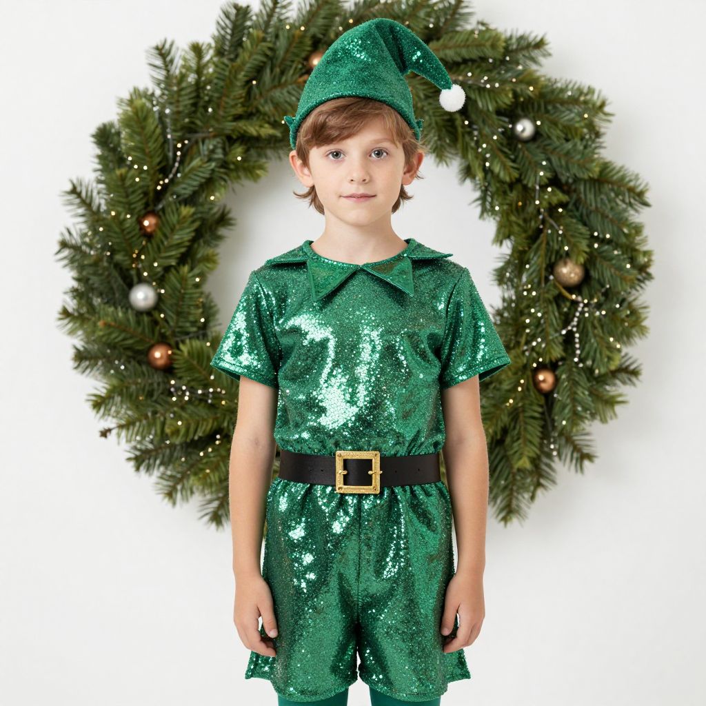 Photograph of a young Caucasian boy with light brown hair, wearing a glittery green elf costume with a matching hat and black belt with a gold buckle. The outfit has short sleeves and a pointed collar. He stands in front of a festive, green pine wreath adorned with small white and gold ornaments. The boy has a neutral expression and stands centered, with his arms slightly down at his sides. The background is plain white, making the green elf costume and wreath stand out prominently.