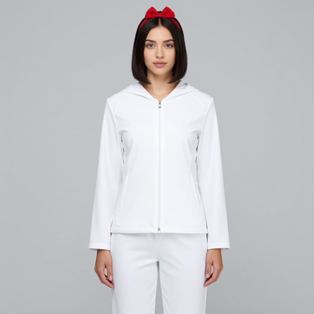 Secy Snow White Costume, woman in a white hooded jacket and pants
