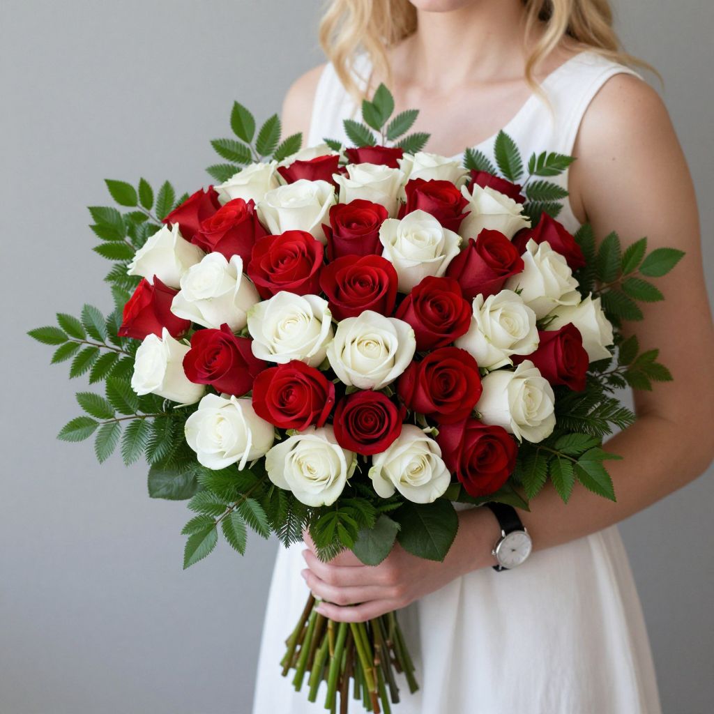 Blonde-haired woman gracefully holding a vibrant bouquet of alternating red and white roses, accented by lush green foliage, while wearing a white dress and a wristwatch.