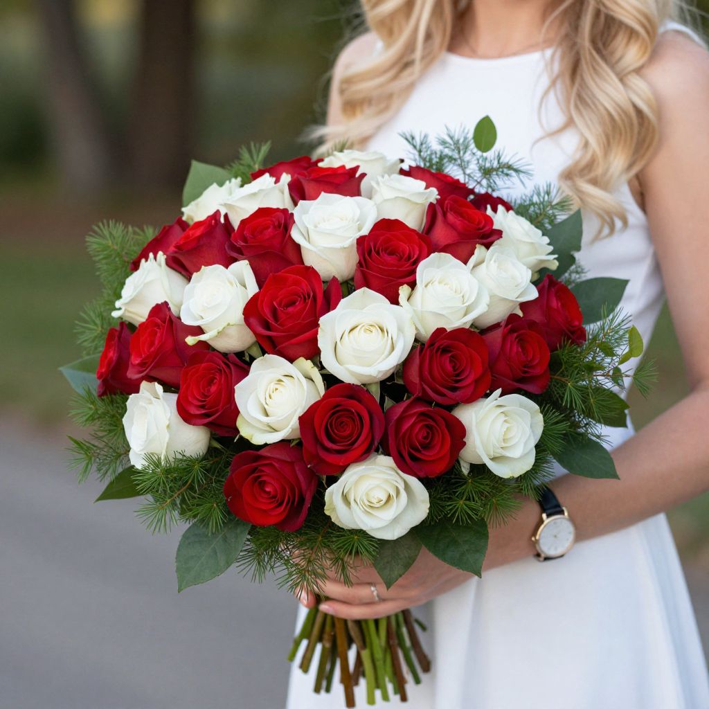Photograph of a woman from the waist up, holding a large bouquet of red and white roses. The bouquet, centered in the image, consists of vibrant red roses interspersed with pristine white roses, surrounded by green pine needles. The woman has long, wavy blonde hair and wears a sleeveless, white dress. She holds the bouquet with both hands, wearing a silver wristwatch on her left wrist. The background is blurred, featuring greenery and a pathway, suggesting an outdoor setting. The image has a bright, natural light, highlighting the vivid colors of the flowers.