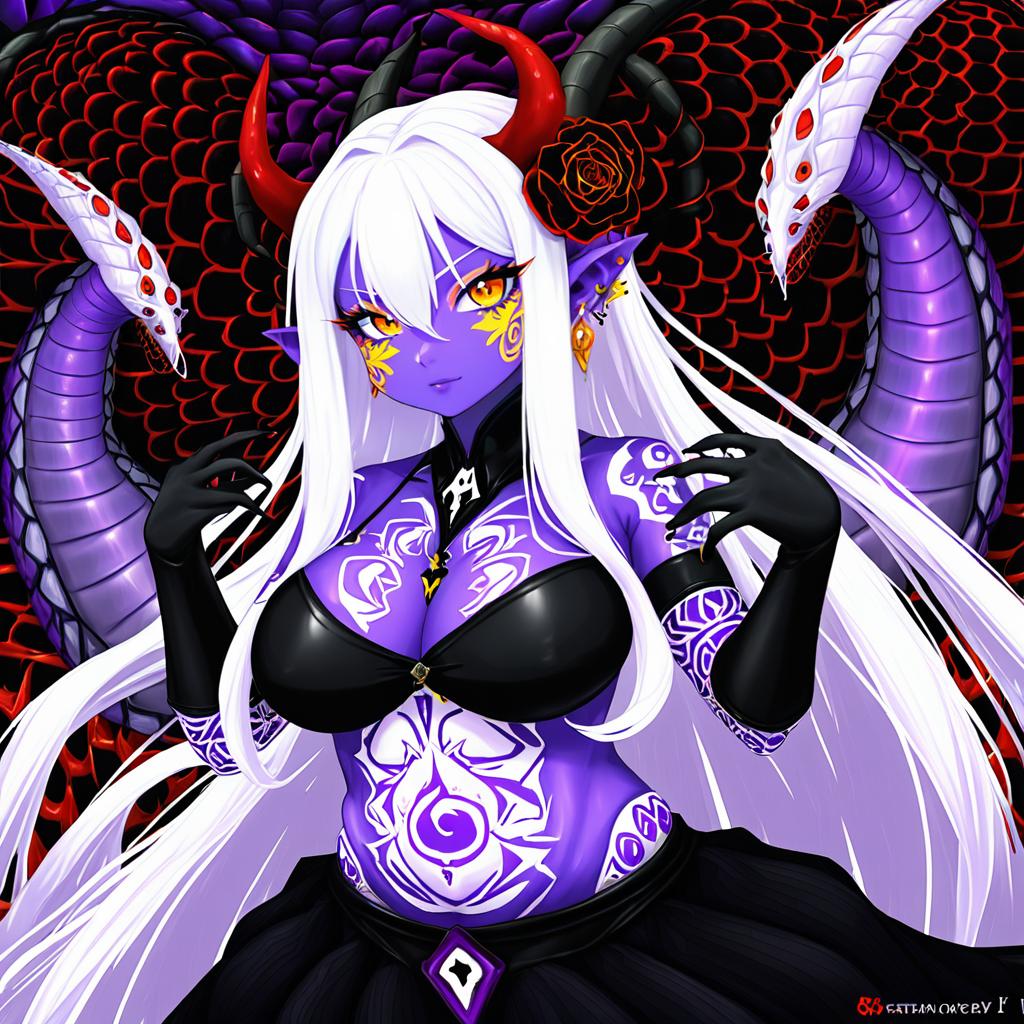 Alipheese fateburn xvi, mon-musu quest!, 1girl, purple skin, pointy ears, horns, yellow eyes, hair between eyes, eye tattoo, white hair, very long hair, long hair, hair tattoo, hair flower, large breasts, breast tattoo, navel, stomach tattoo, facial tattoo, elbow gloves, black gloves, black skirt, lamia, scales, single earring, by artist silverxp, anime