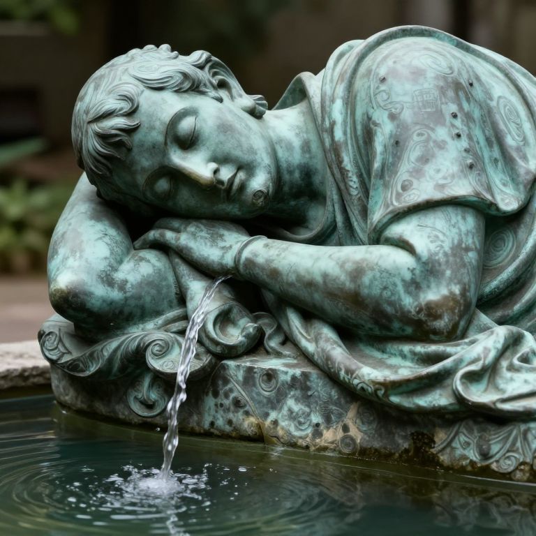 A bronze statue of a sleeping philosopher, crafted with intricate details and a weathered patina, features water flowing gracefully from its mouth into a serene pool, evoking a timeless and contemplative atmosphere.