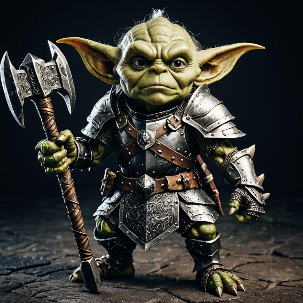 A full-body picture of a goblin warrior, wearing metal armor and holding a big hammer, dumbfounded expression, detailed fantasy illustration, Dungeons & Dragons style