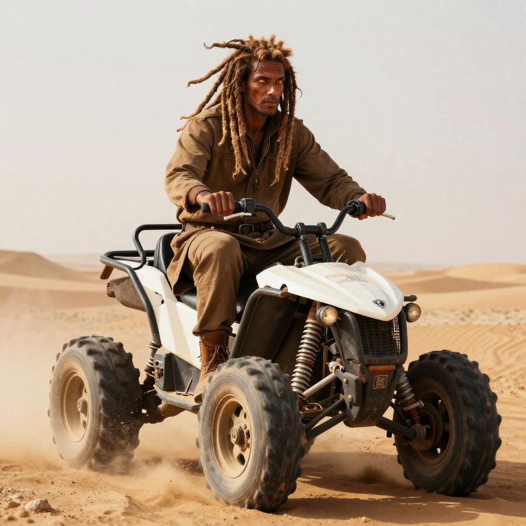 A cinematic photo of a futuristic drone commander riding a multi-rotor aerial transporter. Hyper-detailed, neon green hair, glowing amber eyes, captured with Panasonic Lumix GH5, 25mm lens, dynamic pose, 8K resolution
